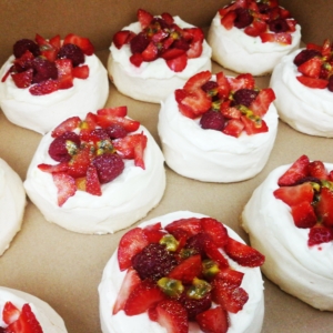 Mini Pavlova cu bezea, crema de mascarpone, lime si fructe asortate.