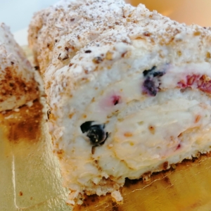Rulada de bezea cu mascarpone, zmeura, afine, fistic, lime si apa de trandafiri.