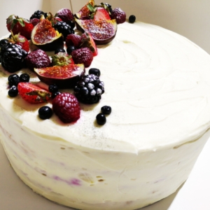 Tort cu blat de vanilie, sos de fructe de padure, crema chantilly, fructe de padure proaspete.