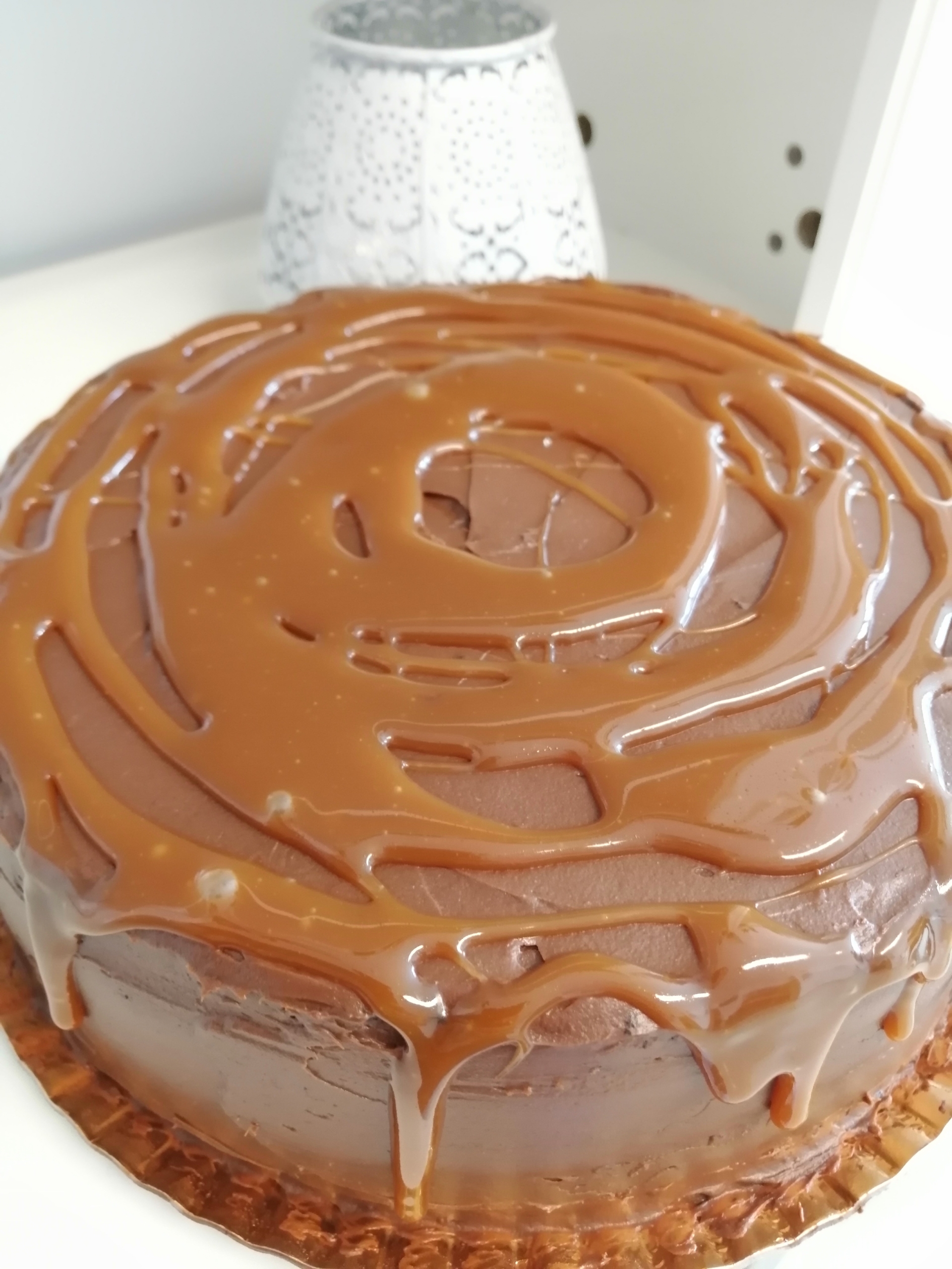 Tort cu blat de cacao, caramel sarat, crema de ganaj de ciocolata belgiana si caramel.