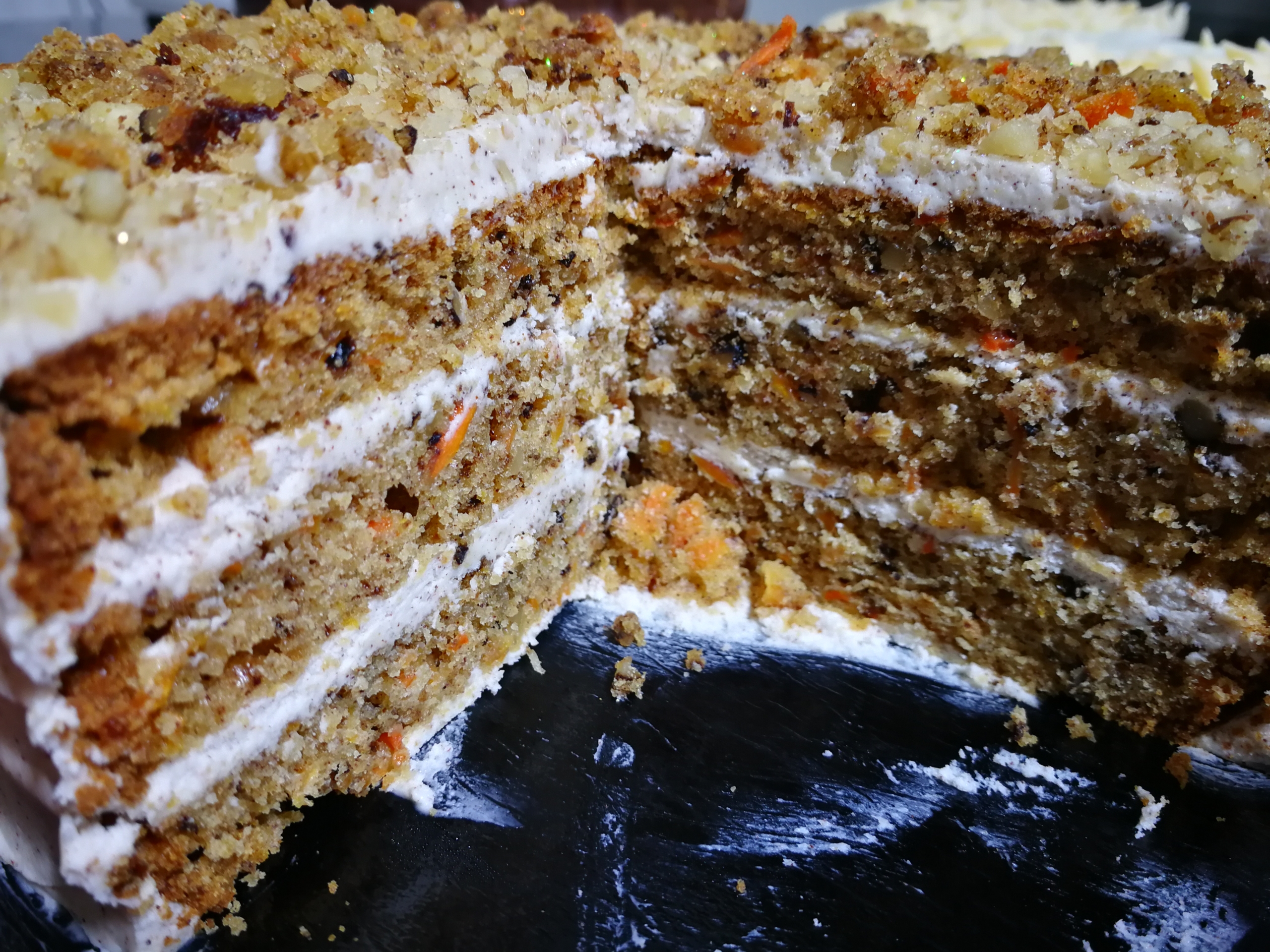 Tort de morcov, nuci, scortisoara, nucsoara si crema de branza.