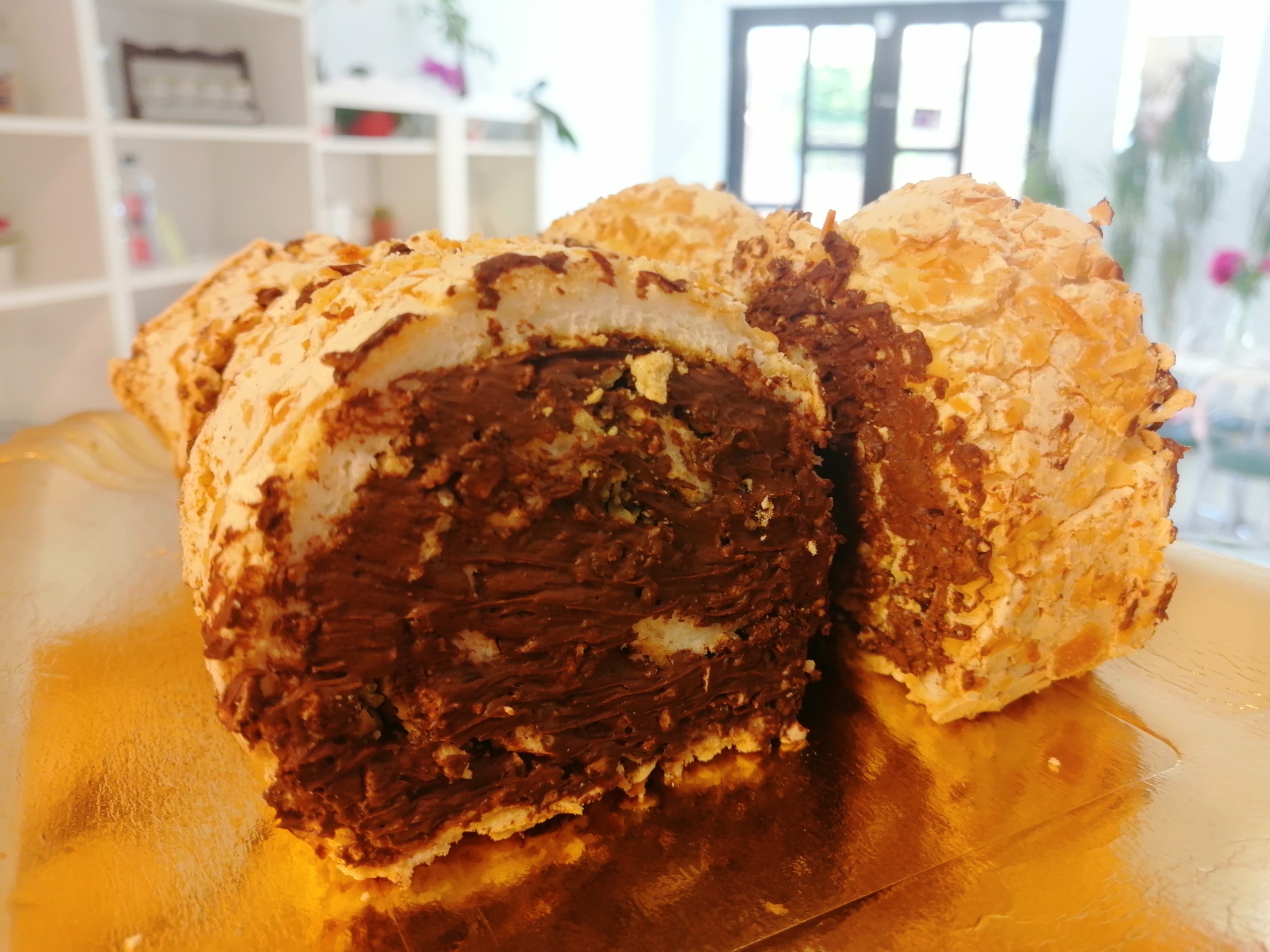 Rulada de bezea cu crema de ciocolata, fulgi de migdale, nuca, rom.